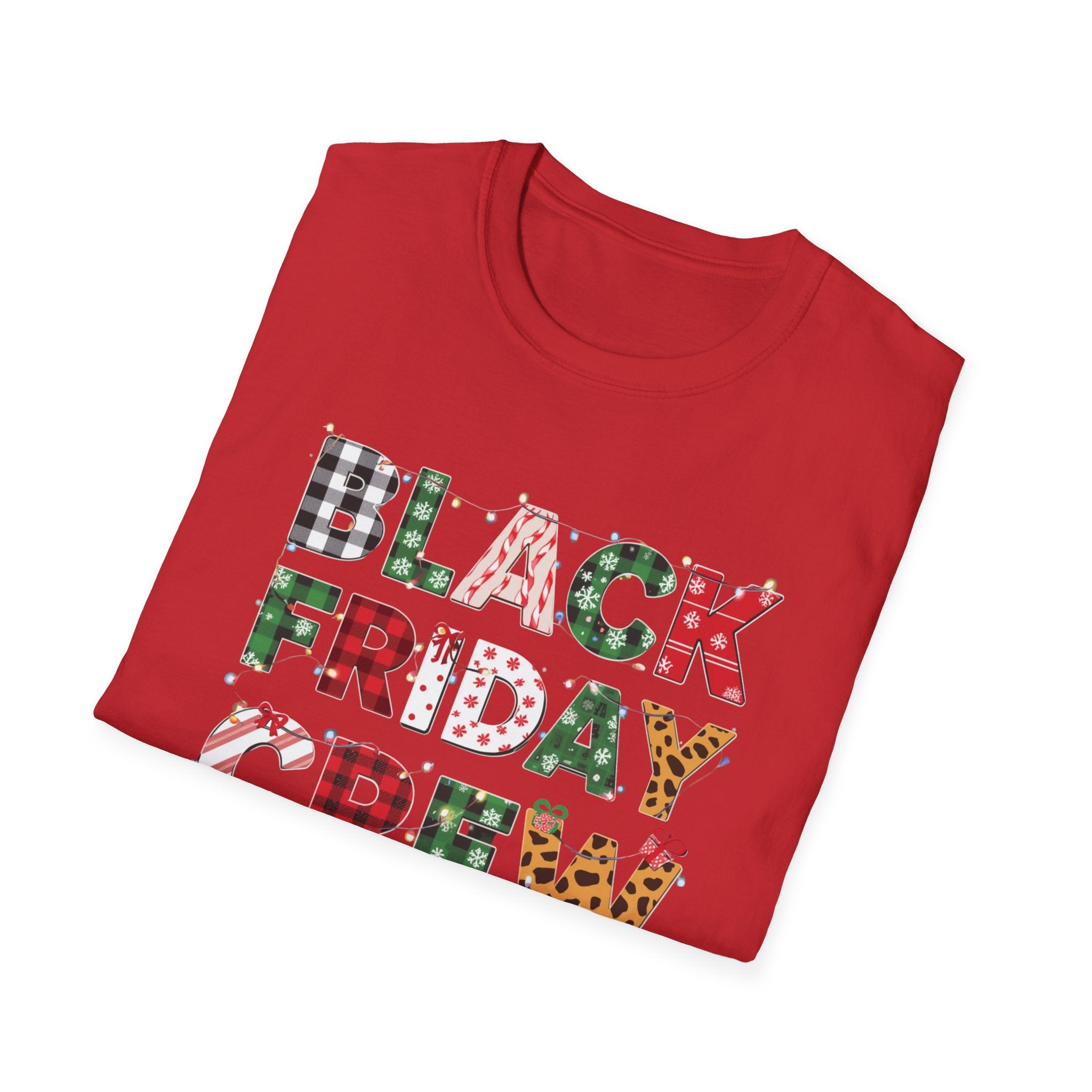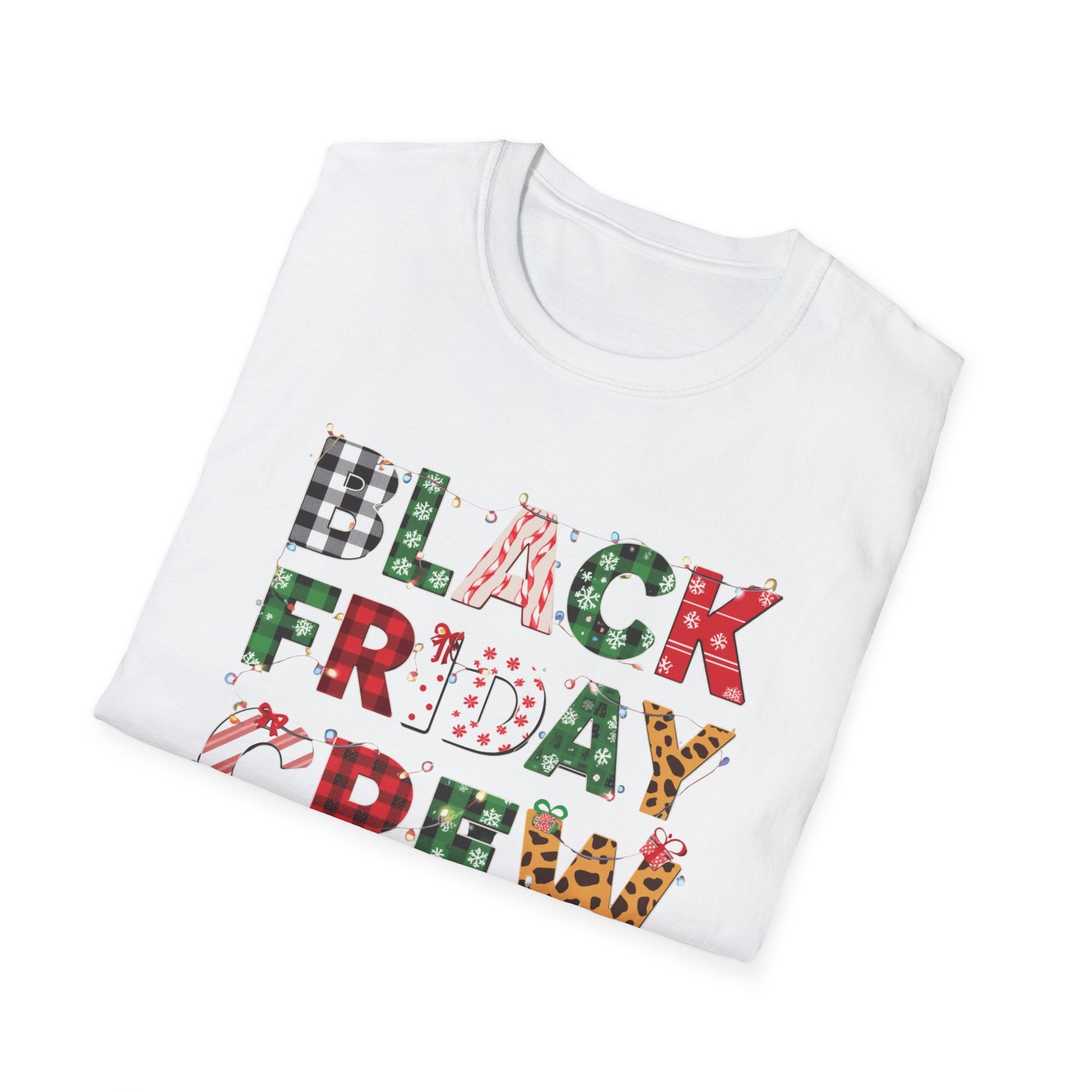 Celebrate the most festive shopping day of the year in style with our Black Friday Crew Shirt! Perfect for retail workers, shopping squads, or families who love matching holiday outfits, this design features bold 3D letters wrapped in twinkling Christmas lights, festive buffalo plaid, snowflakes, peppermint stripes, and leopard print accents.