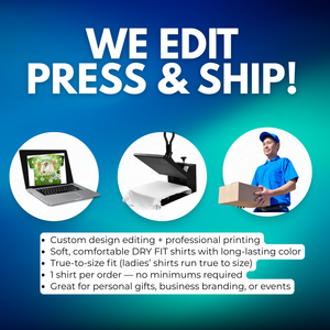 We’ll edit your design for you with your wording and pictures, make sure it fits perfectly on your shirt, and send you a preview for approval before printing. Once you say yes, we’ll press, package, and ship your custom tee straight to your door.